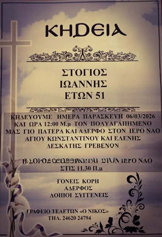 Ο Δήμος Γρεβενών, ανακοινώνει ότι από την Τετάρτη 4 Μαρτίου 2026 τροποποιείται το ωράριο λειτουργίας του Δημοτικού Σταδίου «Μίλτος Τεντόγλου»,…